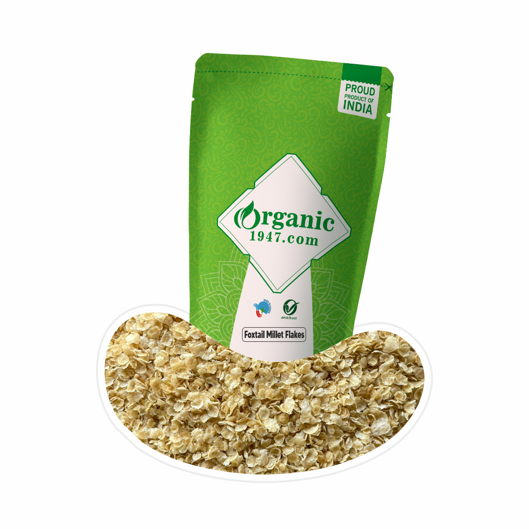6. PACKING- organic1947.com - Foxtail Millet Flakes are hygienically packed in a seal pouch to preserve the purity and aroma of the millet. Organic production- organic1947.com's Barnyard Millet Flakes is 100% certified organic. It is made from Foxtail millet grown without the use of synthetic pesticides, herbicides or chemical fertilizers. The cultivation process follows organic farming principles, which prioritize sustainability, soil health, and biodiversity. Cooking; they can be consumed as a breakfast cereal by adding milk or yogurt and topping it with fruits and nuts.