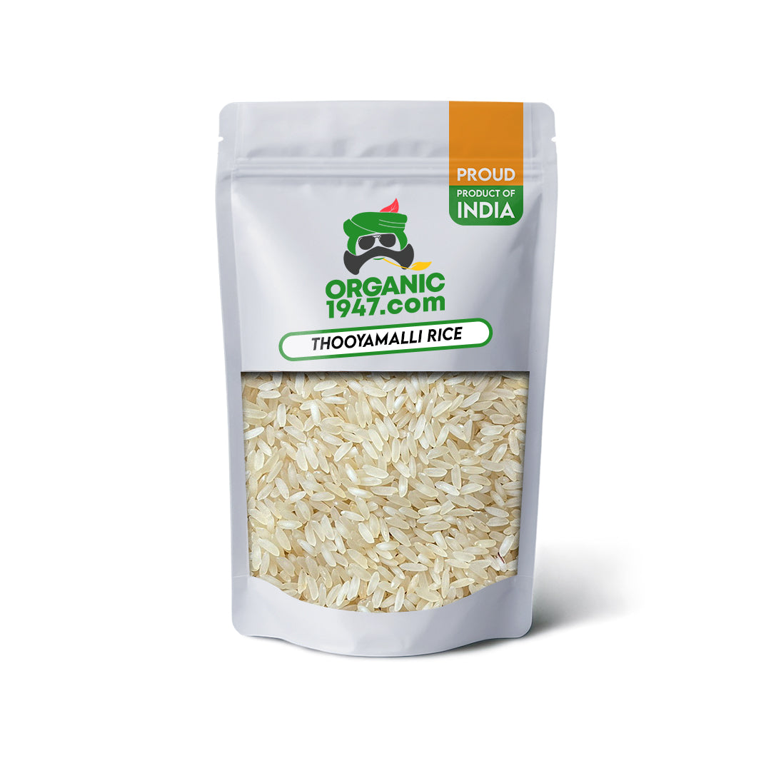 Thooyamalli derives its name from its striking similarity to Jasmine buds. It is a traditional rice variety of Tamil Nadu which is sbort- grained and pearl white in color. Health Benefits; Organic1947.com Thooyamalli rice includes an excellent mix of protein, magnesium, calcium to regulate a balanced and nutritious diet. Supports a healthy nervous system. Improves blood circulation Healthy skin. Helps strengthen internal organs Low glycemic index organic1947.com - Thooyamalli Rice are hygienically packed in a seal pouch to preserve the purity and aroma.